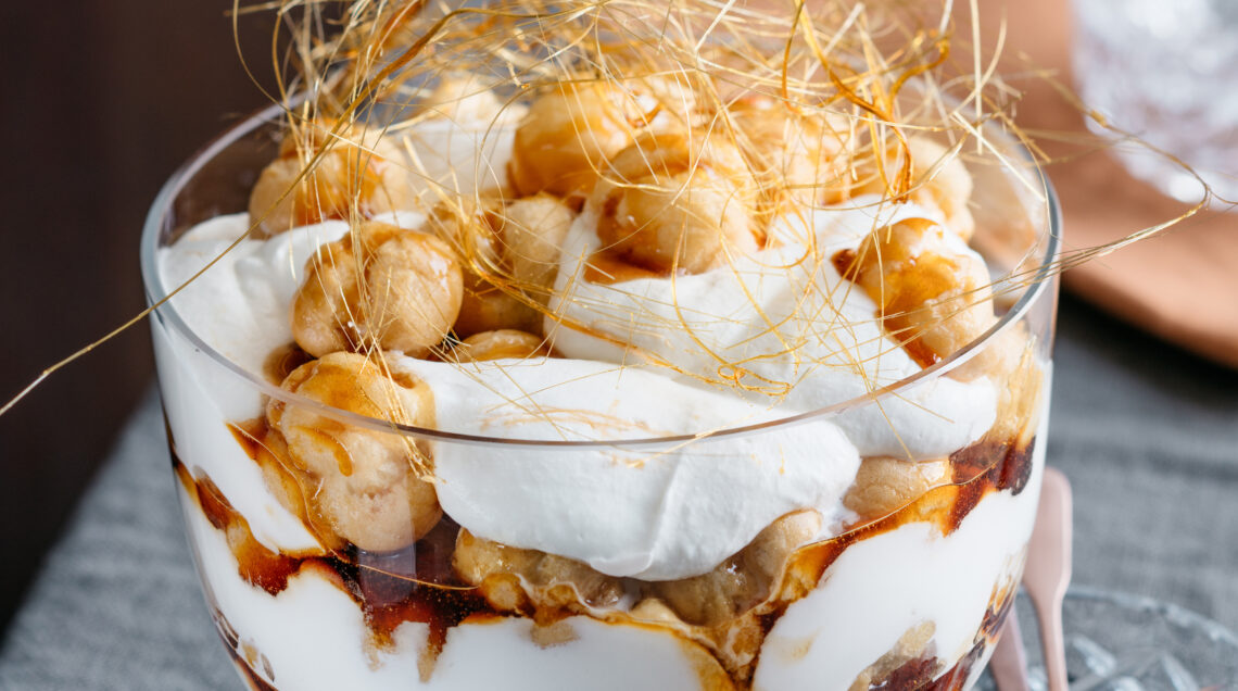 Componete la coppa alternando a strati la panna, i bignè e il caramello distribuito a fili.
