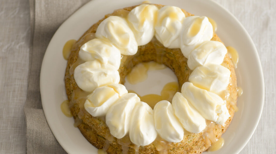 3 Cuocete il dolce in forno già caldo a 180° per circa un'ora, lasciatelo intiepidire e rovesciatelo su una gratella. Quando è freddo mescolate lo yogurt con 50 g di lemon curd e disponetelo a quenelle sulla superficie della ciambella. Servite con il lemon curd rimasto.