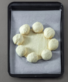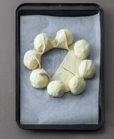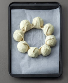 Imburrate e rivestite con carta da forno l'anello di una tortiera a fondo removibile di 26 cm e circondate la corona, in modo che mantenga la forma durante la lievitazione. Mescolate il tuorlo tenuto da parte con 1 cucchiaio di latte e spennellate la superficie della corona; infornate a 180° per 30 minuti.