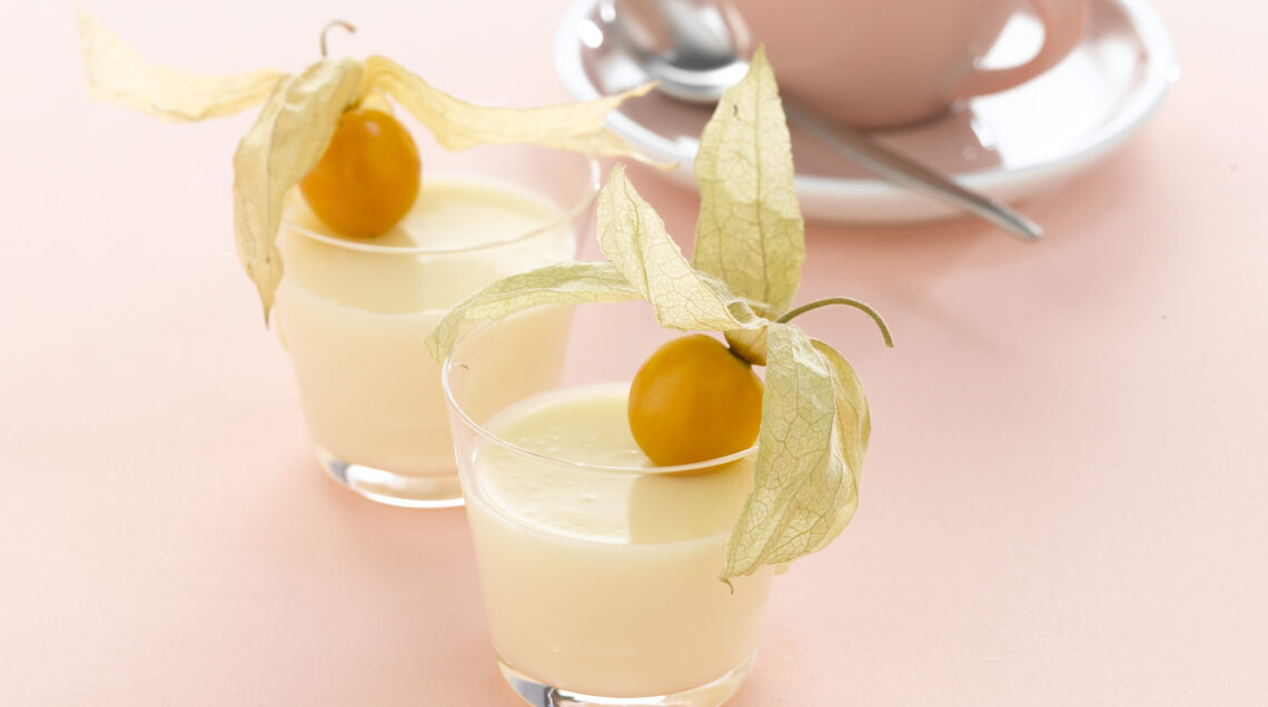 1) Prendi 4 bicchieri da servizio e versa in essi il composto in parti uguali, lascia raffreddare poi sistemali in frigorifero a solidificare per circa 2 ore. Quando iniziano a diventare solidi, lava gli alchechengi, apri bene le foglie e sistemane uno su ogni superficie dei dolcetti.