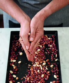 Distribuite le arachidi ben allargate su una teglia e fatele tostare per 10-15 minuti in forno a 150°. Strofinate le arachidi tostate tra le mani, una manciata per volta. Proseguite con l'operazione in modo da staccare tutte le pellicine che le rivestono.