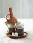 1) Per realizzare la ricetta del Café de Olla messicano, ovvero del caffè nel coccio, innanzitutto sistema 750 ml di acqua all’interno di una pentola di coccio (olla), insieme alla stecca di cannella, al chiodo di garofano, al cioccolato sbriciolato e al piloncillo (uno zucchero grezzo molto scuro dal sapore di melassa; si può sostituire con zucchero di canna).