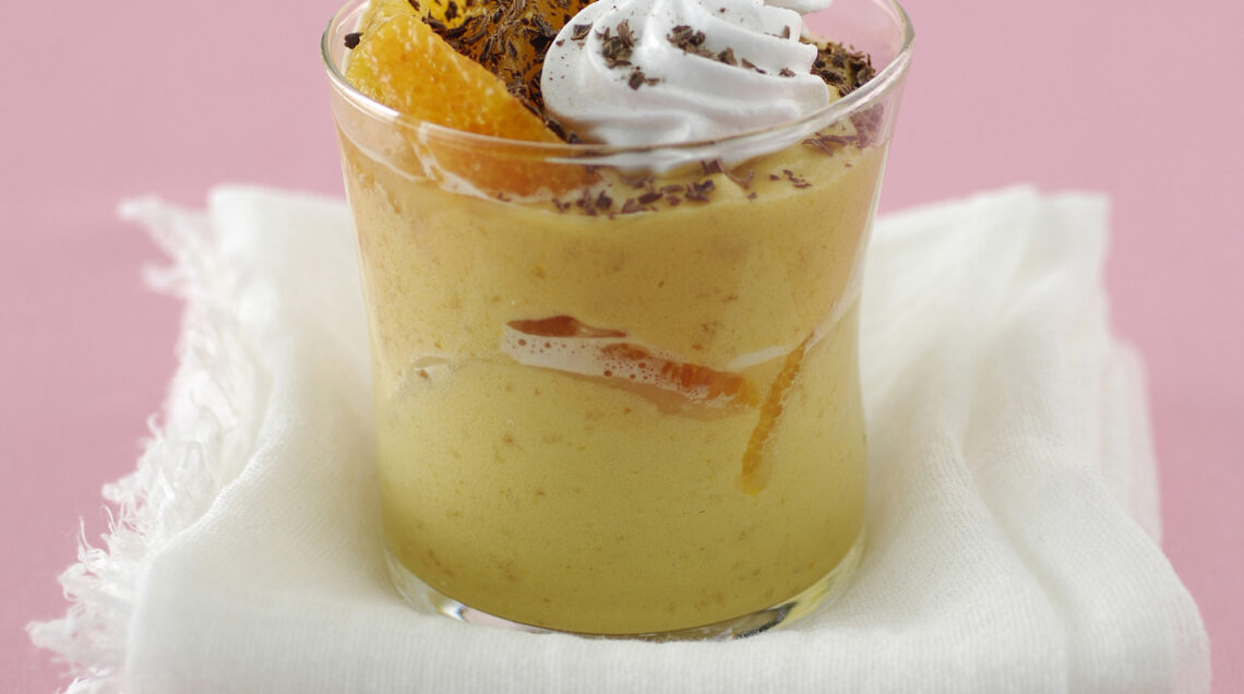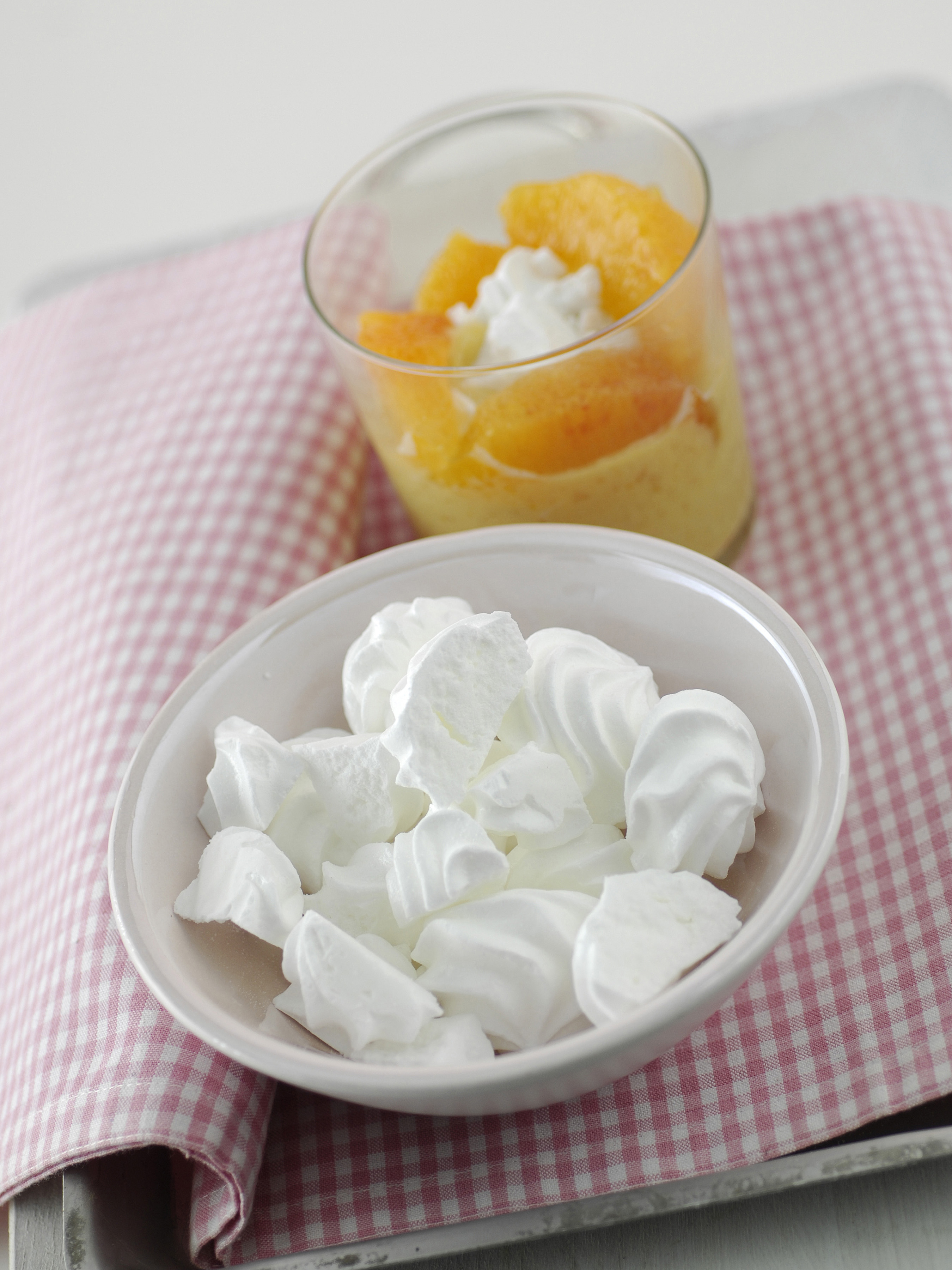 4) Prendi 4 bicchieri, fai un fondo di zabaione, sistema uno strato di meringhe e metti ai lati qualche spicchio di arancia.