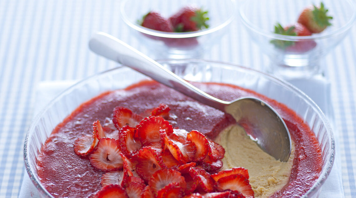 5) Versa il composto di fragole tiepido sul budino e lascia rassodare in frigorifero per 4 ore. Decora con il resto della fragole tagliate in maniera molto sottile e gusta subito la crema cotta al vino Moscato di Sicilia.