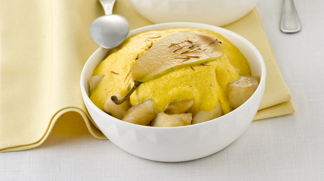 2) Aggiungi il mascarpone ai tuorli e unisci metà degli albumi, poi mescola delicatamente per non smontare la crema al mascarpone. Disponi le pere cotte in 4 coppette, distribuisci la crema in maniera omogenea e decora con le fettine di pera lasciate integre.