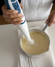 Aggiungi la gelatina strizzata e amalgamala bene, poi monta gli ingredienti con un mixer a immersione per circa 2-3 minuti.