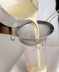 Una volta pronta, filtra la crema con un colino a maglie fitte, poi trita il cioccolato e versa il composto su di esso, a 3 riprese.