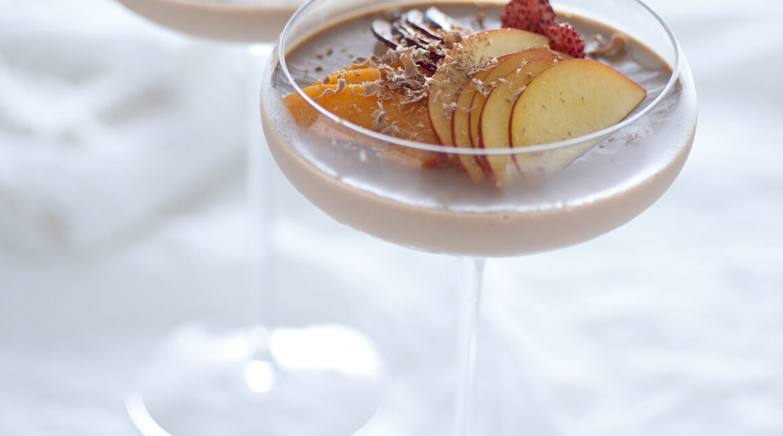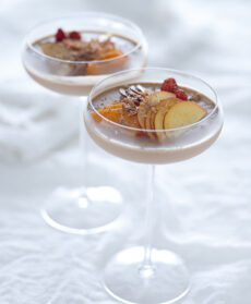 Monda la frutta, taglia a fette la pesca e la prugna, estrai le coppe dal frigorifero e decorale. Gusta subito il cremoso al latte con zenzero e macedonia.