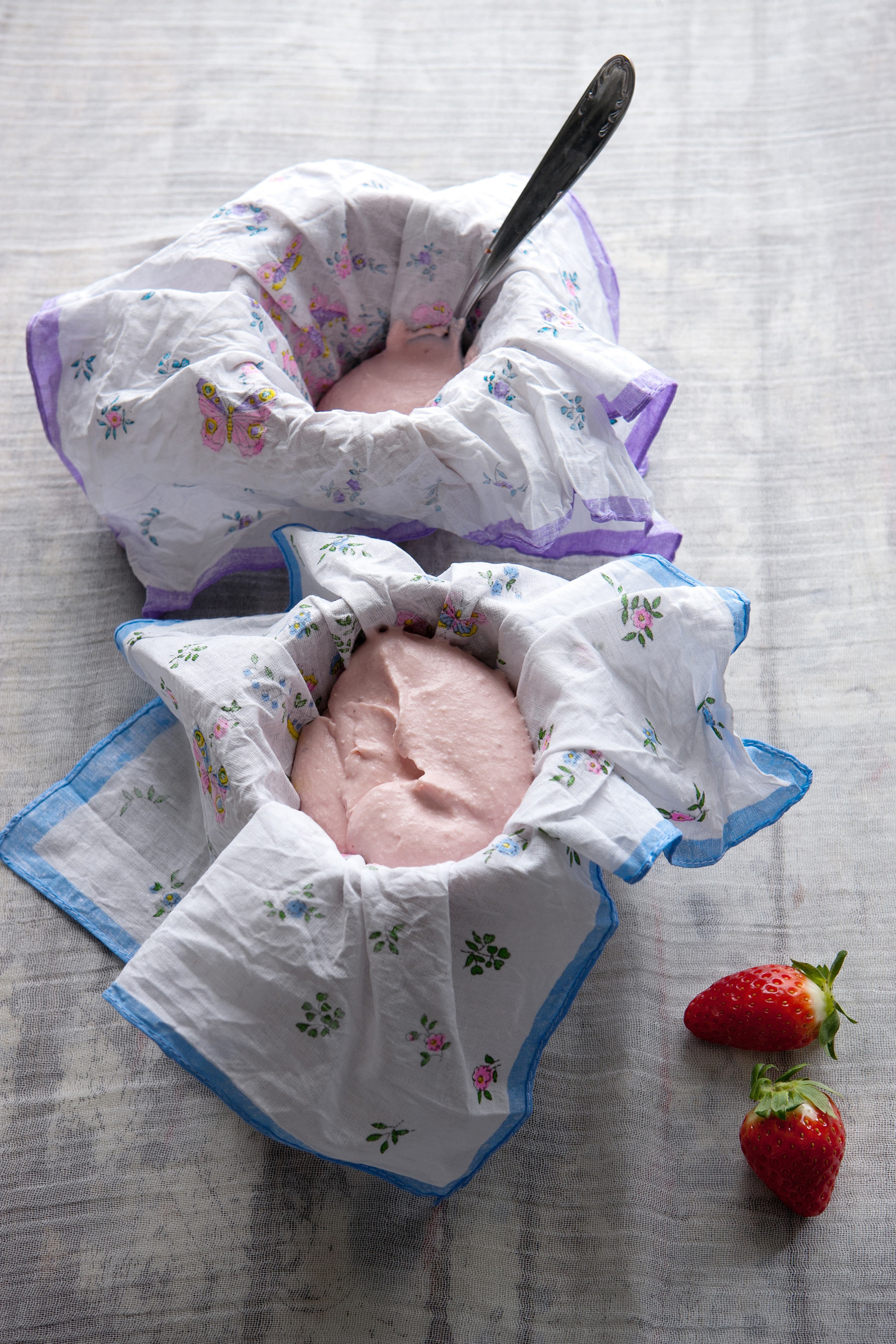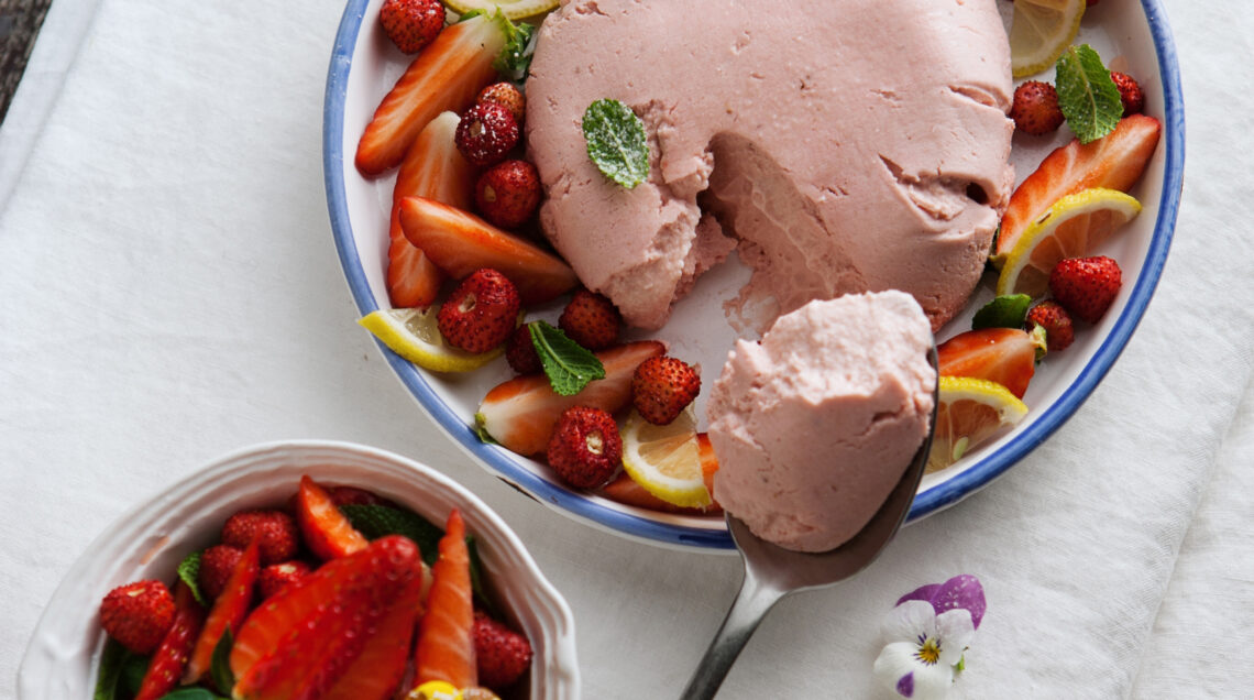 4) Unisci la ricotta setacciata. Monta la panna e aggiungila al composto, infine incorpora delicatamente anche la salsa di fragole.