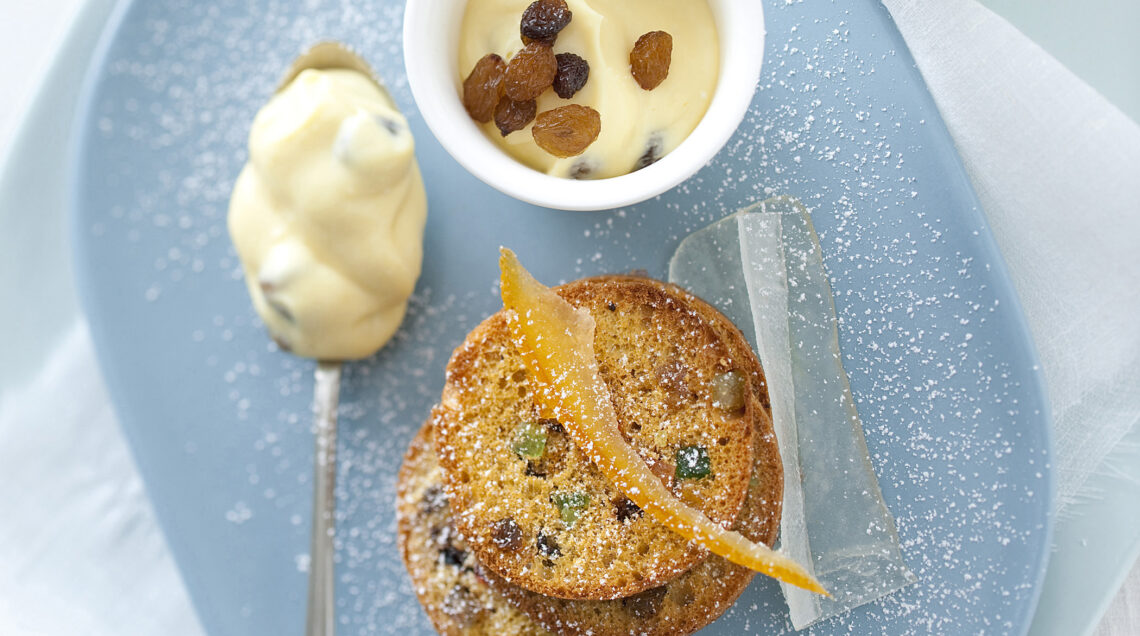 4) Unisci l'uvetta scolata e asciugata e trasferisci la crema in frigo. Taglia i panettoncini a fette in senso orizzontale, tostali brevemente in forno, disponili nei piatti e servili con la crema fredda e i canditi tagliati a filetti o fettine.