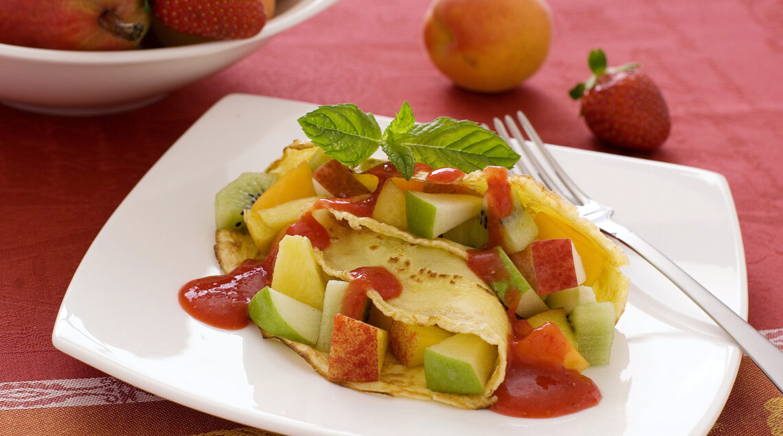 4) Frulla le fragole con lo zucchero rimasto e insaporisci le crepes con la macedonia, irrorandole con la salsa di fragole e profumandole con le foglie di menta.