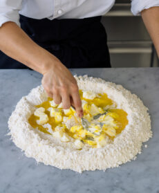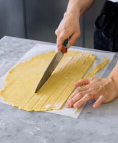 Mettete 2/3 della frolla fra due fogli di carta da forno e appiattitela prima con le mani e poi con il matterello, in modo da ottenere un disco di 3-4 mm di spessore. Stendete nello stesso modo anche la pasta rimasta e tagliate la sfoglia ottenuta in tante strisce di 2 cm di spessore.