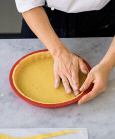 Foderate con il disco di frolla il fondo di uno stampo per crostata in silicone di 26 cm di diametro; con 2-3 strisce di frolla coprite anche il bordo, facendole ben aderire al disco sul fondo.