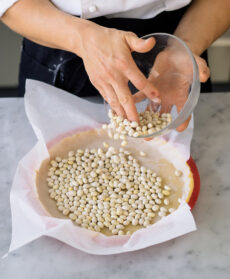 Coprite la frolla con carta da forno e versate abbondanti legumi secchi o pesini per la cottura in bianco. Cuocete in forno già caldo a 160° per circa 25 minuti; sfornate e fate raffreddare il guscio di frolla privato di carta e legumi.