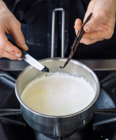 Portate quasi a bollore la panna e unite i semi e la polpa del baccello di vaniglia, inciso nel senso della lunghezza, e la gelatina, fatta prima ammollare in acqua fredda per 10 minuti e strizzata. Mescolate, lasciate intiepidire e amalgamate anche i tuorli montati con lo zucchero; fate raffreddare.