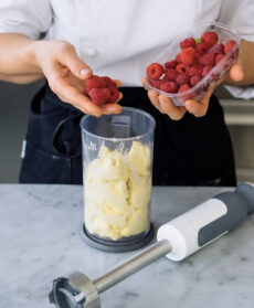 Disponete metà della crema ottenuta nel bicchiere del frullatore a immersione, unite i lamponi e frullate a lungo; trasferite le due creme in due tasche da pasticciere e mettete in frigorifero.