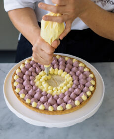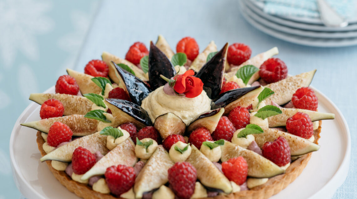 Fichi al cioccolato bianco e lamponi ai limoni e alla menta fanno di questo dessert casereccio una proposta elegante e creativa
