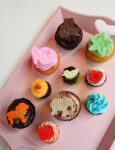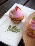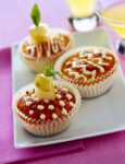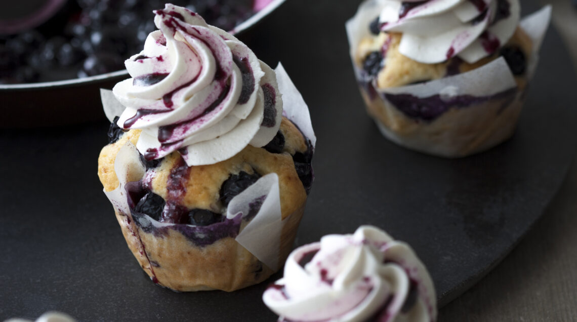 4) Riempi di crema al burro una tasca da pasticciere con bocchetta a stella. Spremi dei ciuffi di crema sopra ogni cupcake. Nappa con la crema di mirtilli e servi.