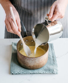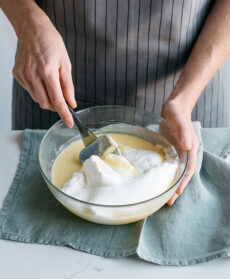 Montate la panna, ben fredda di frigo, e amalgamatela con delicatezza al composto di uova e latte utilizzando la spatola.