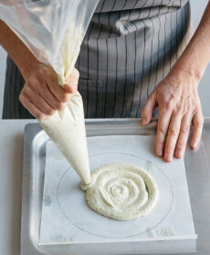 Rivestite 2 grosse teglie rettangolari con 2 fogli di carta da forno su ognuno dei quali avrete disegnato la sagoma di un disco di 18 cm di diametro. Con una sac à poche distribuite a spirale il composto di meringa formando 2 dischi e cuoceteli in forno a 170° per 12-15 minuti. Togliete dal forno e lasciate raffreddare