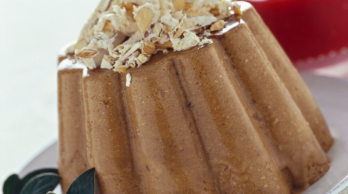 3) Al momento di servire, sforma la bavarese di caffè al torrone sul piatto di portata, dopo aver immerso il contenitore in acqua calda per qualche minuto: decora con il resto del torrone e accompagna con la salsa ai lamponi.