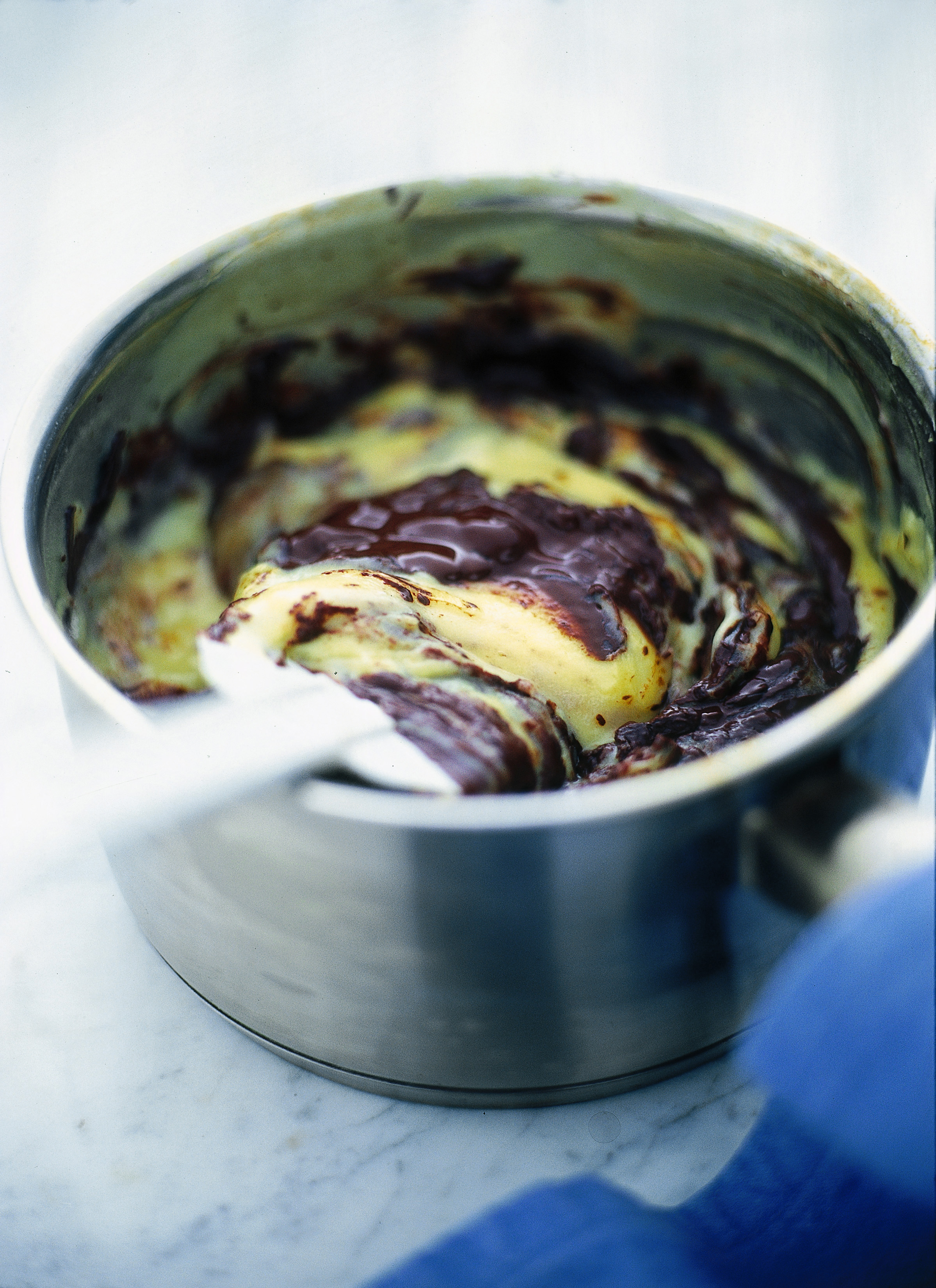 2) Mentre la crema cuoce, ammorbidisci la gelatina in acqua fredda. Sminuzza la pasta di cacao, aggiungila alla crema e amalgama fino a quando non è perfettamente sciolta, poi segui lo stesso procedimento per la gelatina strizzata.