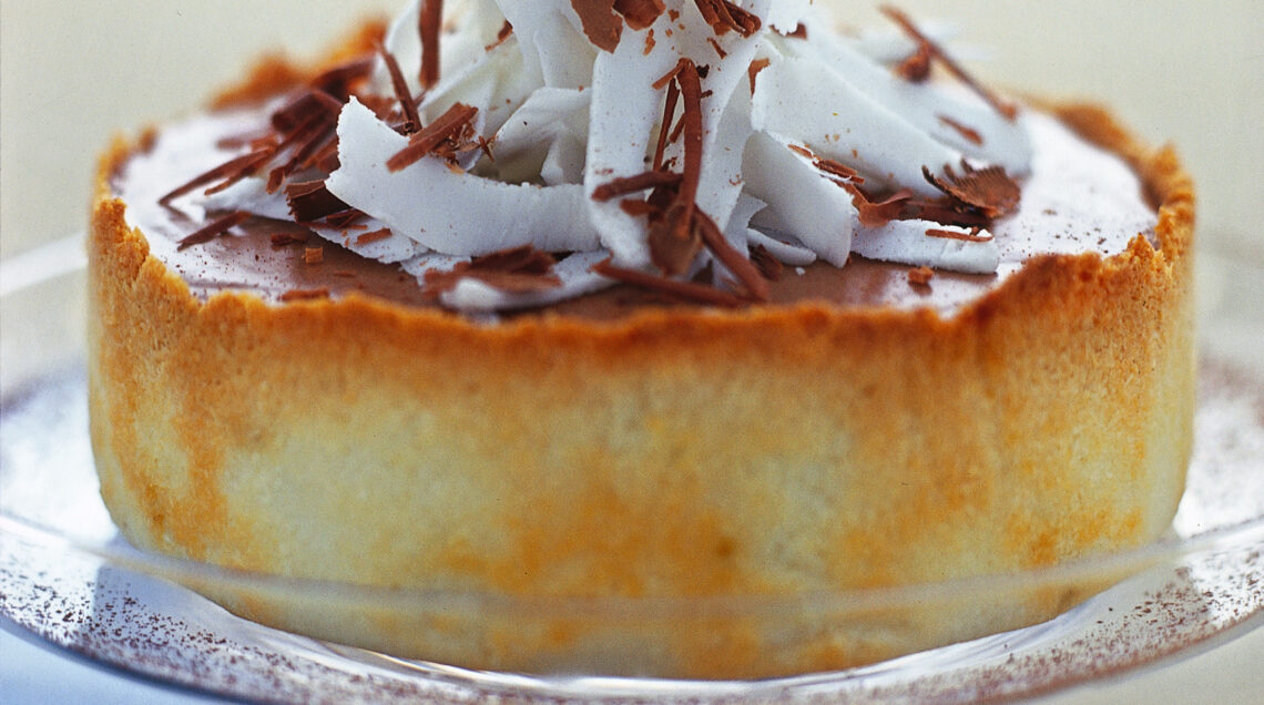 5) Mentre la crosta cuoce, monta la panna e amalgamala alla crema. Estrai la base al cocco dal forno, versaci la crema e lascia raffreddare in frigorifero per 6 ore. Sforma la bavarese al cocco e decorala secondo il tuo gusto, con cocco fresco e scaglie di cioccolato.