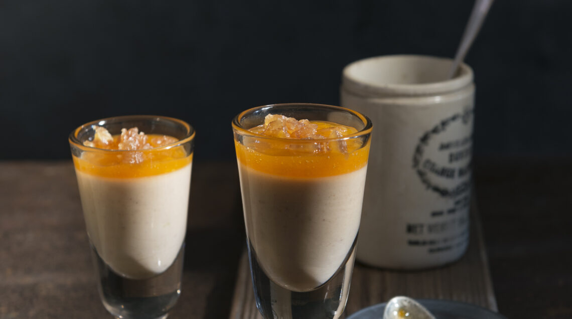 3 Mettete i bicchieri in frigorifero e fate raffreddare la bavarese per almeno 4 ore. Al momento di servire sbucciate i cachi e frullate la polpa con lo zucchero. Guarnite con la salsa di cachi e qualche briciola di marron glacé.