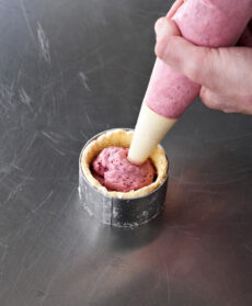 Riempiteli con il composto, chiudete con altri savoiardi, bagnate anche questi con il frullato e mettete in frigo per 4 ore. Fate sobbollire la panna e lo zucchero rimasti con la vaniglia. Sformate le charlotte, guarnitele con frutti di bosco e pistacchi e completate con la salsa alla vaniglia e il gelato.