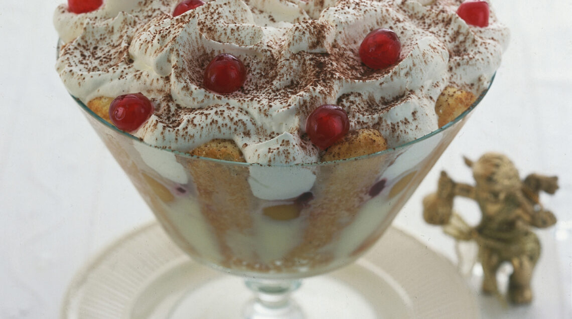 2) L’ultimo strato deve essere di panna: fai poi riposare la coppa inglese in frigorifero per circa 2 ore. Al momento di servire decora la coppa inglese alla frutta con cacao e ciliegie.