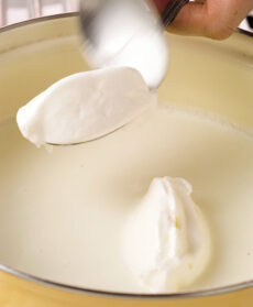 Ora prepara le meringhe. Porta ad ebollizione un litro circa di latte in una casseruola larga e bassa. Poi abbassa il fuoco e aggiungi al latte gli albumi che avevi montato a cucchiaiate. Rigira le meringhe per farle rapprendere da tutte le parti, quindi scolale e sistemale sulla crema.