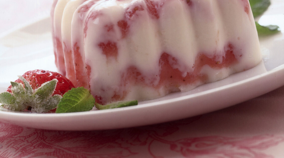 4) Una volta pronta la panna cotta alle fragole immergete gli stampini nell’acqua calda così da poter estrarre la panna cotta con estrema facilità, poi capovolgete gli stampini su un piatto, e come guarnizione aggiungete spicchi di fragole e foglie di menta.