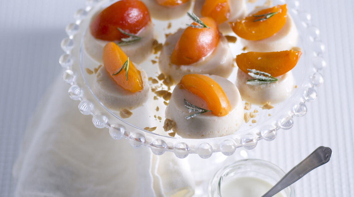 2) Preparate la frutta. Lavate e asciugate bene le albicocche, privatele del picciolo, tagliatele a metà ed eliminate i noccioli, poi riducete ogni metà in 2 spicchi. Sciogliete il burro in una padella antiaderente, aggiungete la frutta e saltatela rapidamente con un po' di zucchero semolato e qualche aghetto di rosmarino, mescolando spesso. Lasciate raffreddare bene le albicocche caramellate al rosmarino.