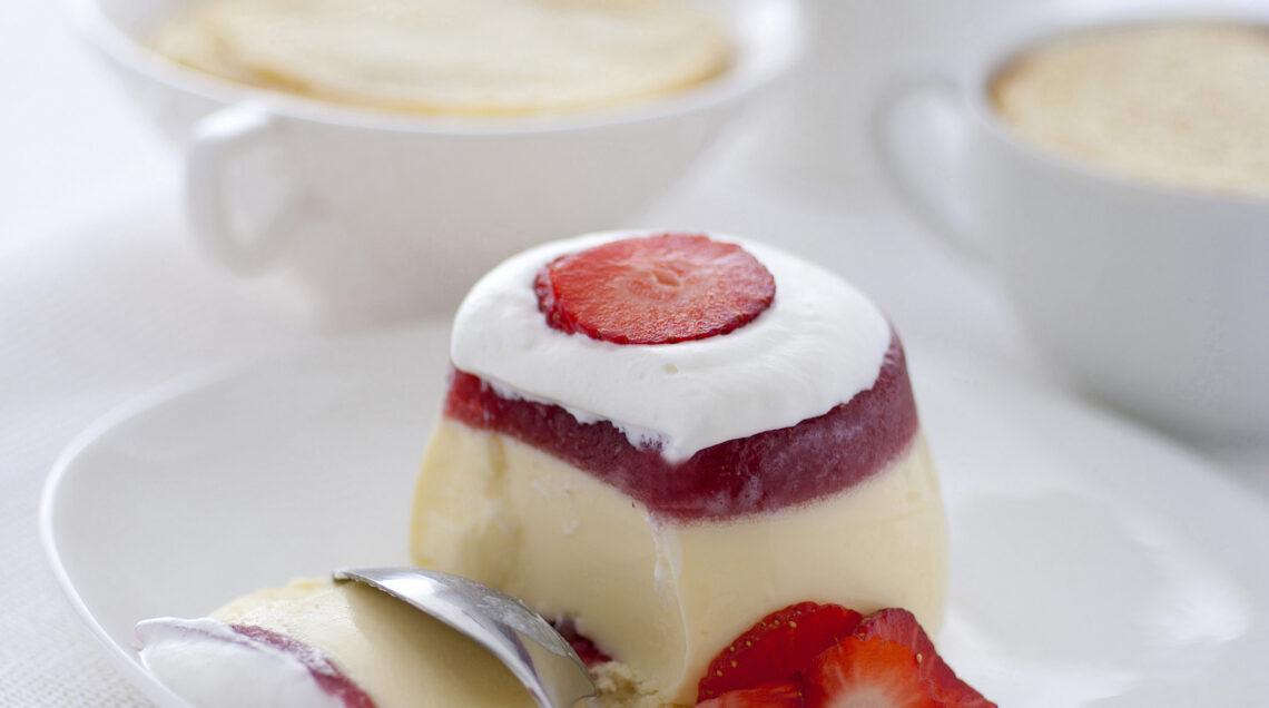 1) Ammorbidisci la gelatina in acqua fredda. Pulisci le fragole, lavale e asciugale. Frullane 400 g con 50 g di zucchero, scaldale su fiamma bassa fino all'ebollizione, unisci 10 g di gelatina strizzata e mescola fino a che si sarà sciolta. Versa il composto in 6 tazze da tè e lascia raffreddare e solidificare in frigo.