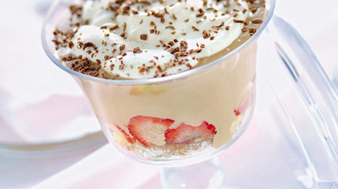 4) Versa la crema ottenuta sulle fragole e completa il dolce con la panna rimasta, per poi decorare a piacere con il cioccolato rimasto, spezzettato o grattugiato.