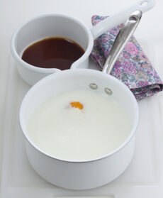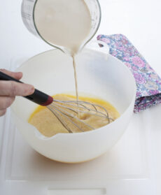 Con una frusta a mano sbattete brevemente le uova e i tuorli insieme allo zucchero rimasto. Unite il latte aromatizzato, mescolate e versate il tutto negli stampi di alluminio monoporzione.