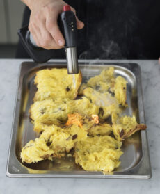 Spezzettate il panettone (potete preparare questo dolce anche con panettone raffermo), disponetelo in una teglia e gratinatelo con un cannello (o sotto il grill del forno) in modo che diventi croccante in superficie.