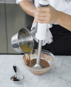 Preparate la glassa al cioccolato. Fate bollire il succo d'arancia con l'anice stellato. Spegnete il fuoco, lasciate in infusione per 20 minuti e filtrate il succo. Riducete il cioccolato a scaglie, fatelo sciogliere a bagnomaria e poi unite il succo di arancia a filo frullando con un frullatore a immersione.