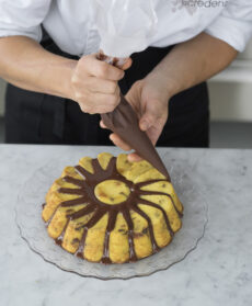 Mettete la glassa al cioccolato in una tasca da pasticciere usa e getta, tagliate la punta della tasca in modo da ottenere un'apertura larga 1/2 cm e fate colare la glassa sul budino disegnando dei raggi.