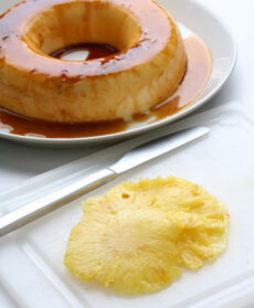 Un budino insolito, preparato con succo d'ananas e latte concentrato. La raffinata decorazione ne fa una piccola opera d'arte da gustare al cucchiaio
