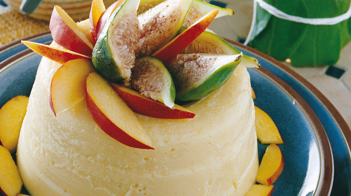 6) Sforma il budino su un piatto da portata, decoralo con le pesche rimaste a spicchi e, se vuoi, con qualche fettina di fico. Accompagna con la salsa di fichi.