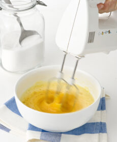 Intanto in una terrina lavora 4 uova intere e un tuorlo, aggiungi 120 grammi di zucchero e ottieni un composto chiaro. Aggiungi il latte alla vaniglia filtrato con un colino.