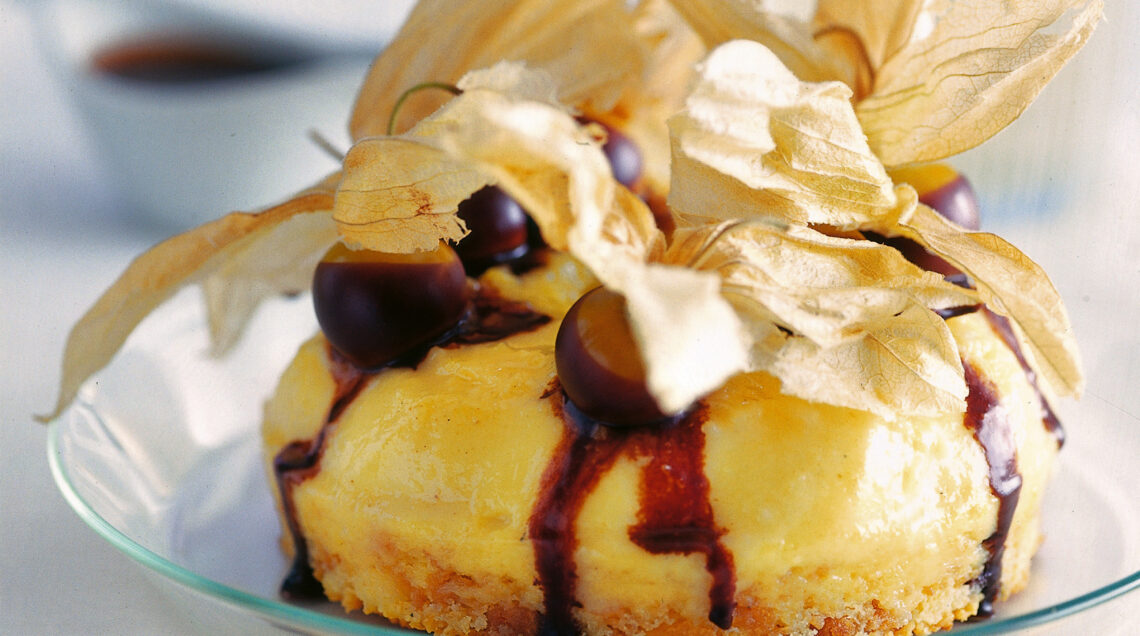 3) Prendi gli alchechengi, sbucciali e immergili nel cioccolato, senza sporcare le foglie e il gambo, poi adagia delicatamente i frutti sulla cupola ai savoiardi con crema al rum e servila pure accompagnata dal resto della salsa.