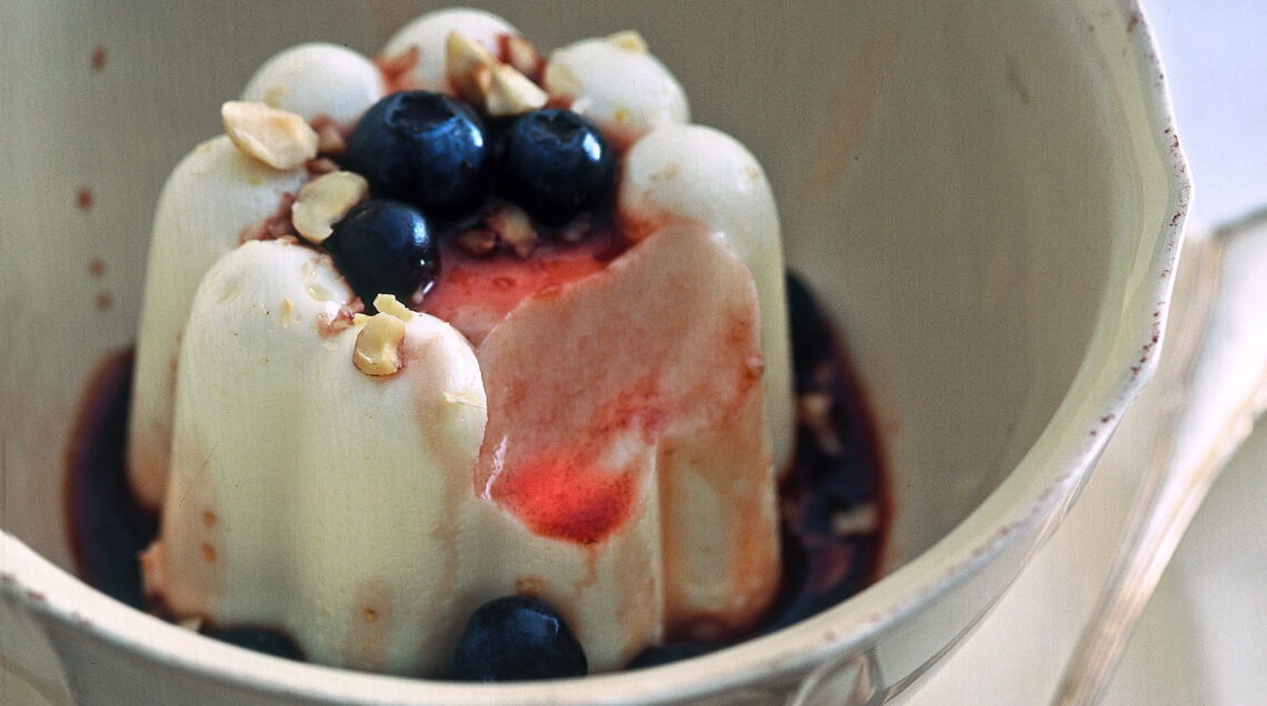1) Tira fuori dal frigo gli stampini e sforma la panna cotta su un piattino. Guarniscila disponendo tutto intorno qualche mirtillo e una manciata di nocciole tritate.