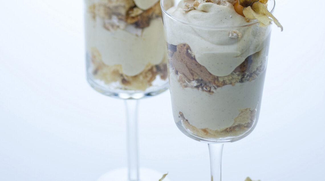 3) Lascia riposare i bicchieri in frigorifero per 2 ore: prima del servizio dividi in 4 pezzi la fetta di panettone tenuta da parte, tostala, poi utilizzala per decorare insieme agli alchechengi i tuoi calici speziati al panettone.