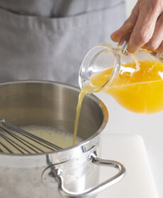 Mettete a bagno la gelatina in acqua fredda. Montate i tuorli con lo zucchero fino a ottenere un composto chiaro e spumoso. Unite la fecola, disponete il composto in una casseruola e mettete su fuoco basso. Incorporate il latte versandolo a filo, poi il succo di mandarino e infine quello d'arancia: cuocete finché la crema si sarà addensata sempre mescolando con la frusta.
