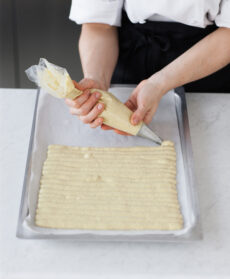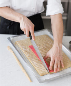 Rifilate uno dei lati piò lunghi del biscotto, quindi tagliate con un lungo coltello 2 strisce lunghe 10 cm e alte 4 cm (aiutandovi con un righello), che serviranno per il bordo delle charlotte, e incidete con un tagliapasta di 8 cm 2 dischetti, che userete per la base.