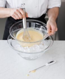 Montate i tuorli rimasti in un ciotola con l'uovo e lo zucchero semolato rimasto finché avrete ottenuto una crema chiara e spumosa. Aggiungere il purè d'albicocche bollente (potete usare quello pronto in vaschetta oppure pelare e frullate 4 grosse albicocche). Incorporate bene; scaldate il composto a bagnomaria finché arriva a poco prima del punto d'ebollizione (82°) e unite la gelatina ammorbidita e strizzata. Trasferite la ciotola in un'altra con cubetti di ghiaccio e lasciate intiepidire fino alla temperatura di 45°. Fate fondere separatamente il cioccolato e 75 g di burro e, quando saranno tiepidi, uniteli al composto. Trasferite la mousse in una tasca da pasticciere con bocchetta liscia e lasciate raffreddare in frigorifero per almeno 4-5 ore.