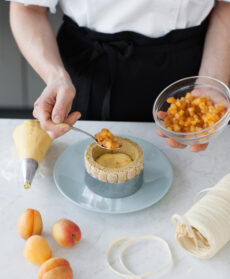 Un dolce al cucchiaio raffinato ed elegante, interamente home made, dalla pasta biscotto al tè Matcha alla mousse di albicocche e cioccolato bianco