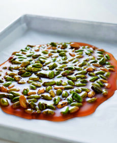 Eliminate le pellicine dei pistacchi e tostateli (vedi il riquadro giallo a sinistra). Fate sciogliere in un pentolino 80 g di zucchero con 2 cucchiai di acqua e qualche goccia di succo di limone, fino a ottenere un caramello ambrato. Unite i pistacchi, mescolate e versate il croccante su carta da forno. Lasciatelo raffreddare e spezzettalo finemente. Intanto fate ammorbidire la gelatina in acqua fredda.